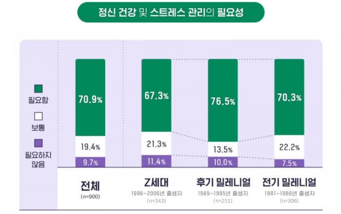 ▲ 사진제공=대학내일MZ세대(밀레니얼 세대와 Z세대를 통칭) 상당수가 정신 건강 관리가 필요한 것으로 나타났다. 코로나19가 장기화하면서 ‘코로나 블루’, ‘코로나 레드’ 등 정신 건강의 적신호를 의미하는 신조어가 생겨났다. 그런 상황에 MZ세대는 몸 건강뿐만 아니라