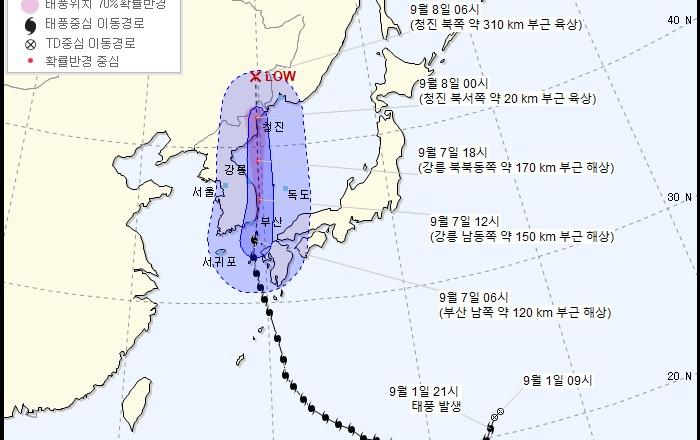 ▲ 제10호 태풍 하이선 예상 경로(9월7일 7시 발표)[출처=기상청]제10호 태풍 ‘하이선’의 영향권이 부산에 들어선 가운데 강한 비바람으로 인한 피해를 최소화 하기 위한 각별한 주의와 대비가 요구된다.우선 뉴스를 통해 재난정보 및 기상상황을 미리 파악해 둬야한다.바