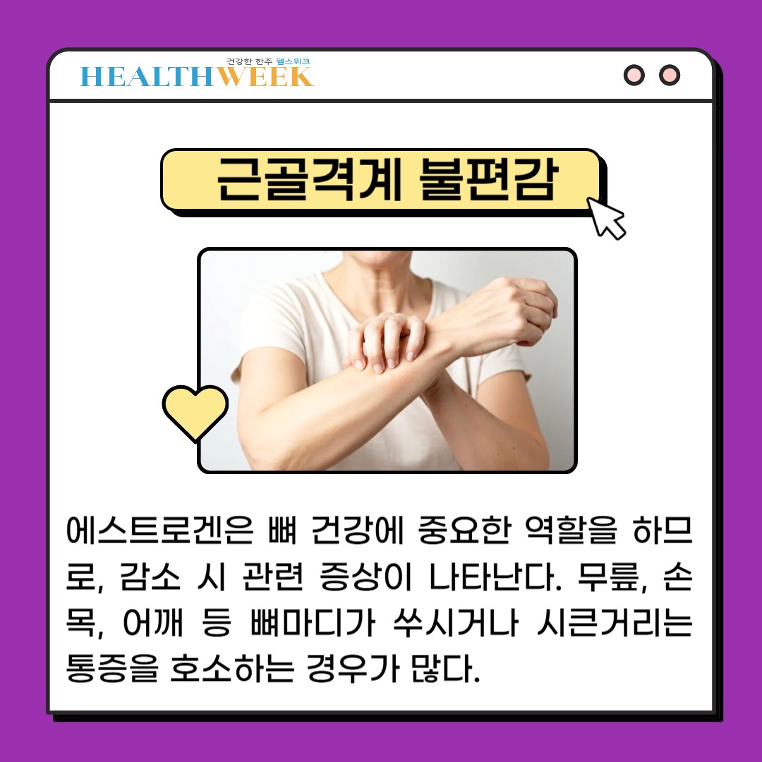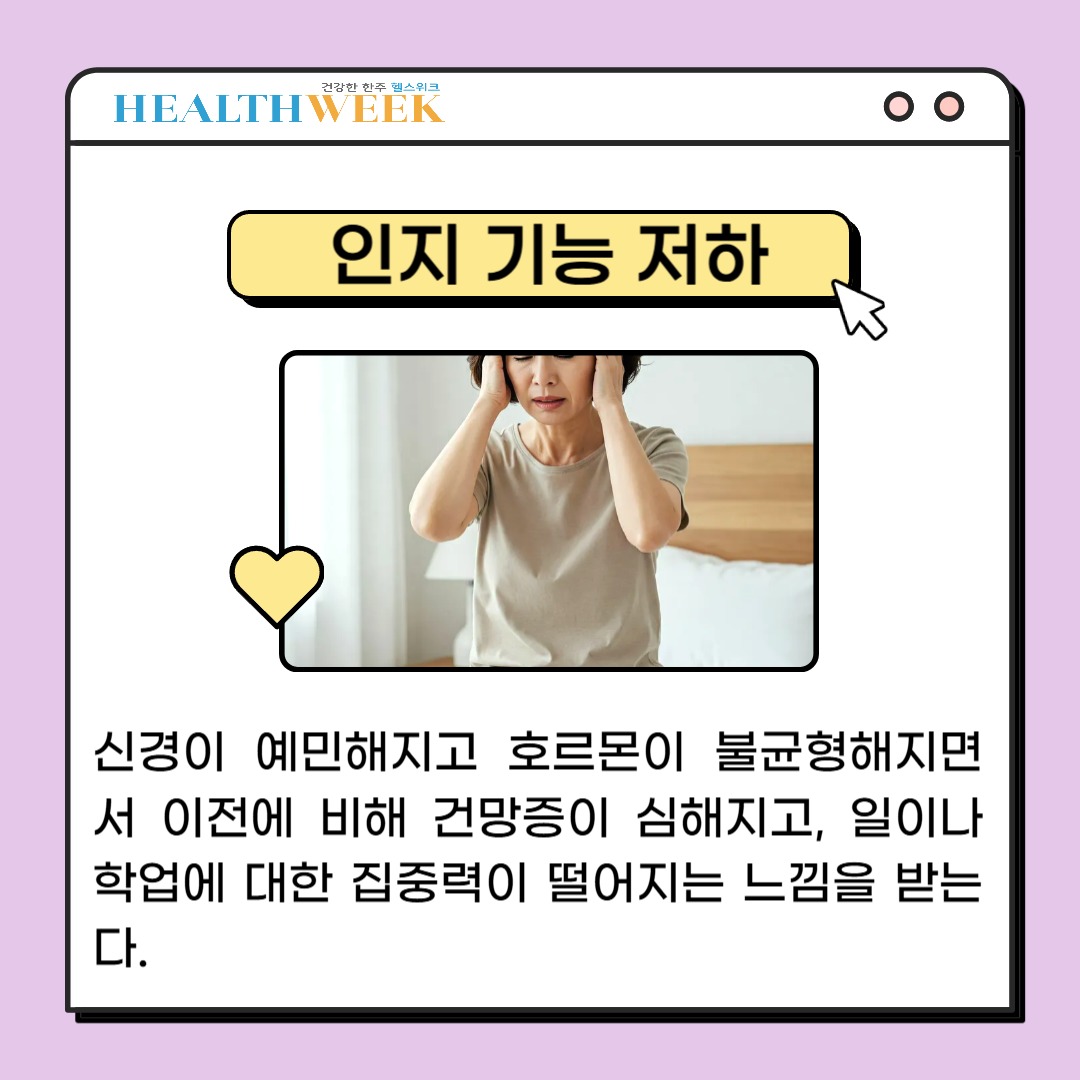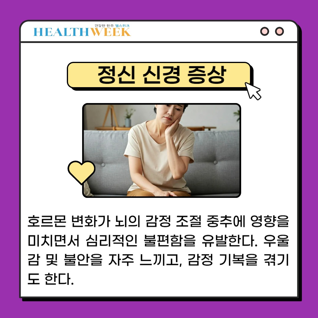 갱년기는 난소 기능 저하로 인해 여성 호르몬인 에스트로겐이 급격히 감소하면서 나타나는 신체적, 정신적 변화의 시기이다. 개인차가 크지만, 많은 여성이 다음과 같은 4가지 증상을 경험한다.
