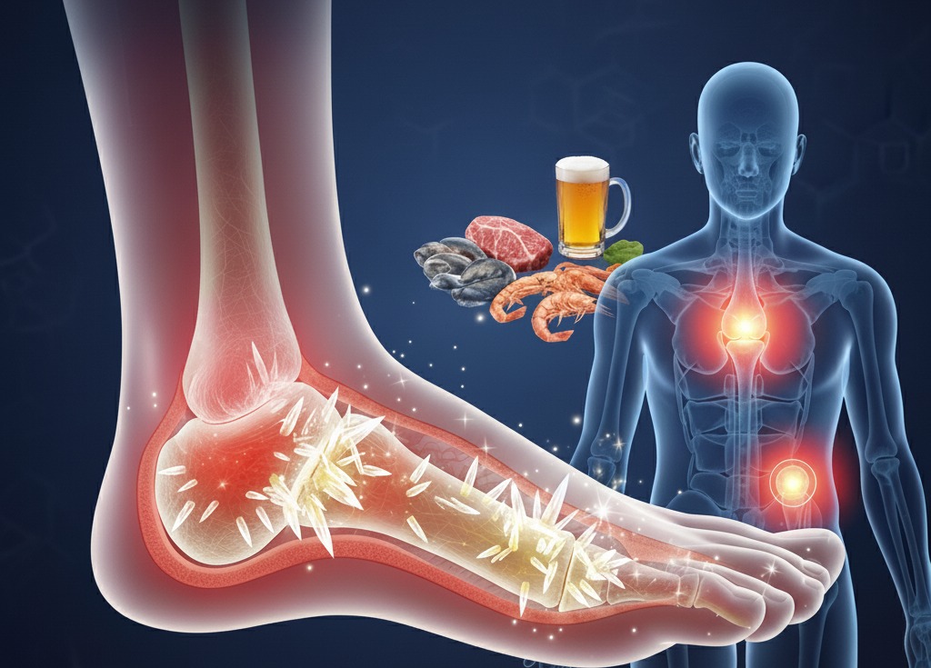 통풍은 혈중 요산 농도가 높아지면서 요산 결정이 관절, 힘줄, 주변 조직에 쌓여 염증을 일으키는 질환이다. 통풍 발작이 시작되면 갑작스러운 관절 통증과 함께 부종, 발적이 나타나며, 주로 엄지발가락, 발목, 무릎, 손가락 관절에서 자주 발생한다. 발작은 대개 밤에 시작되어 손을 대기조차 어려울 정도로 극심한 통증을 동반하며, 그 고통의 정도는 종종 출산에 비견되기도 한다. 이러한 발작이 반복되면 관절 변형과 통풍 결절이 생기면서 결국 만성 관절염으로 진행될 위험이 있다.