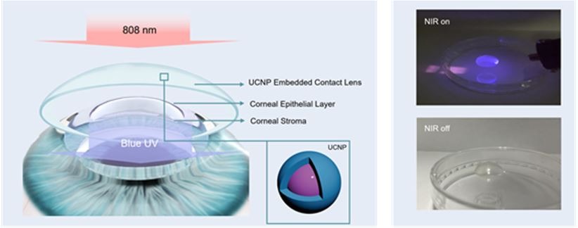 연구팀은 각막 상피를 그대로 둔 채 치료가 가능한 상피투과성 각막 교차결합술을 개발했다. 이 기술의 핵심은 ‘빛을 바꾸는 렌즈’와 ‘각막 투과 광염료’ 두 가지다. 먼저 근적외선 같은 인체에 비교적 안전한 낮은 에너지의 빛을 받아 자외선·청색광으로 바꾸는 상향변환 나노입자를 설계했다. 이 나노입자를 의료용 실리콘으로 만든 콘택트렌즈 안에 균일하게 집어넣어, 렌즈 자체가 작은 광원처럼 빛을 내도록 만들었다. 해당 렌즈는 가시광선 투과율이 88.7%에 달해 일반 시야 확보에도 무리가 없다. 겉으로는 평범한 렌즈지만, 근적외선이 들어오면 렌즈 안에서 자외선·청색광 등 필요한 빛만 골라 보내는 ‘빛 필터이자 빛을 만들어 내는 작은 공장’의 역할을 한다.