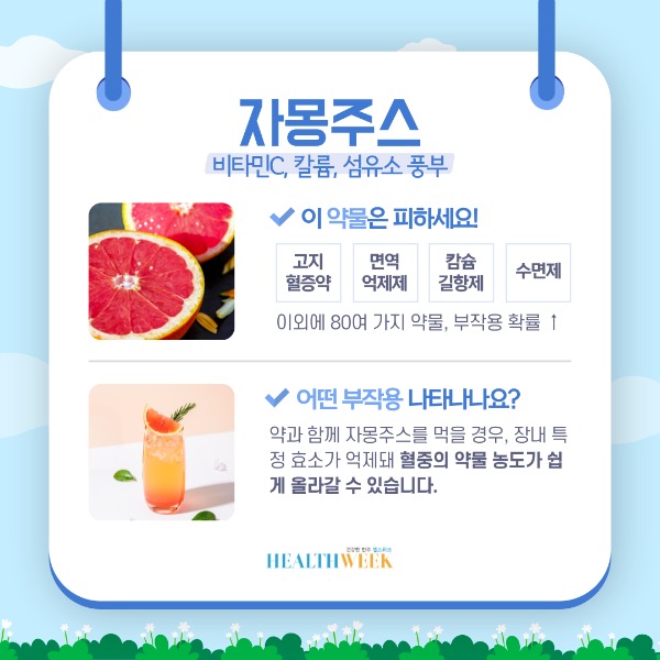 약과 함께 먹으면 예상하지 않았던 문제가 발생할 수 있는 음식들이 있다. 그런 음식들은 함께 먹은 약의 효과를 떨어뜨리거나, 소화 장애부터 의식의 변화까지 다양한 부작용을 일으키기도 한다. 그러므로, 약은 가능하면 물과 같이 먹고 올바른 복용법을 지키도록 해야 한다.