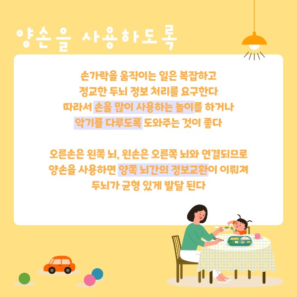 똑똑한 아이로 성장시키고 싶은 부모 마음은 모두 같을 것이다. 그러나 부모의 과욕으로 아이가 흡수할 수 없을 정도의 정보를 주입 시키면 오히려 아이가 스트레스를 받거나 산만해질 수 있다. 생각보다 큰 준비나 노력 없이도 생활 속에서 두뇌를 자극하는 방법은 다양하다. 우리 아이 두뇌 발달을 도와주는 네 가지의 육아 팁을 알아보자.