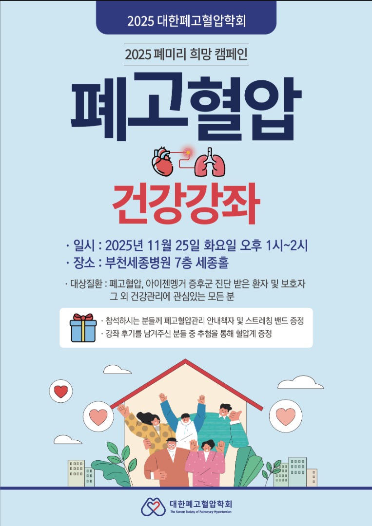 부천세종병원은 오는 25일 오후 1시부터 병원 7층 세종홀에서 ‘2025 폐미리 희망 캠페인 : 폐고혈압 건강강좌’를 시행한다.